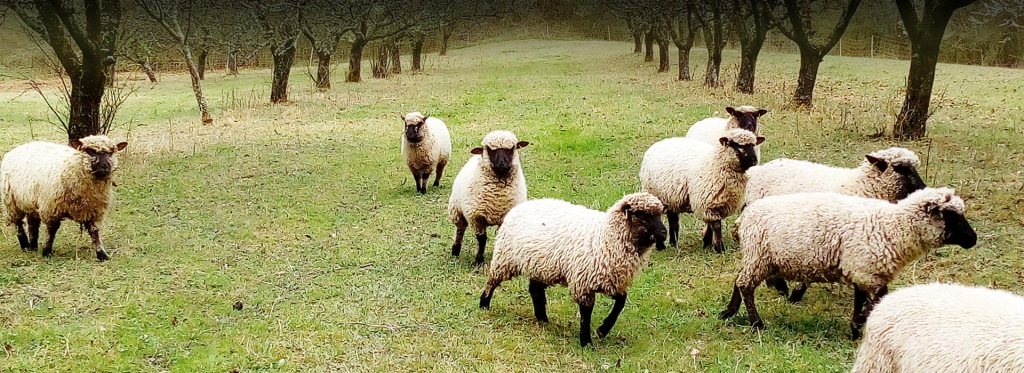 Nous entretenions avec nos brebis shropshire nos vergers en agriculture biologique. Nous avons opéré une sélection afin de maintenir la qualité de respect de l’arbre : nos moutons shropshire ne mange à aucun moment de l’année les écorces d’arbres.